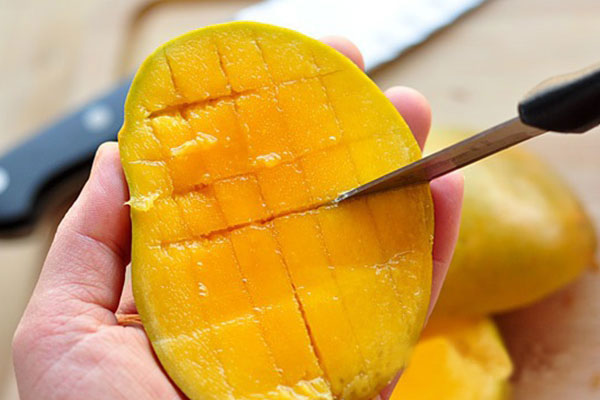 用水果刀将芒果竖着划几刀,确保果肉被分开但是不要切透果皮。